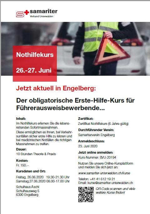 Aufgrund grosser Nachfrage und Warteliste beim aktuellen Nothilfekurs von diesem Wochenende (12.&13. Juni) findet in Engelberg bei Interesse ein zusätzlicher Nothilfekurs statt.